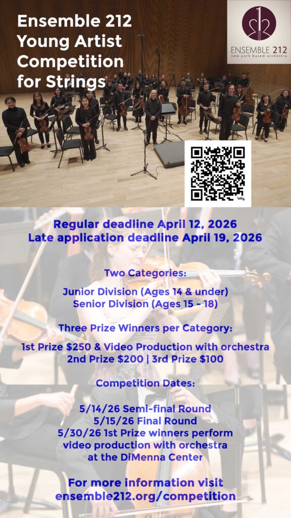 The competition is open to applicants worldwide. There will be two divisions; the junior division for applicants ages 14 and under and the senior division for applicants ages 15 to 18. The semi-final and final rounds will be held virtually. Two 1st Prize winners in each division will be invited to make a professionally produced video performance with Ensemble 212 at the DiMenna Center for Classical Music in New York City. The final video production will be permanently uploaded to Ensemble 212’s YouTube channel allowing their performances to reach unlimited audiences and preserve their achievement as a lasting legacy.